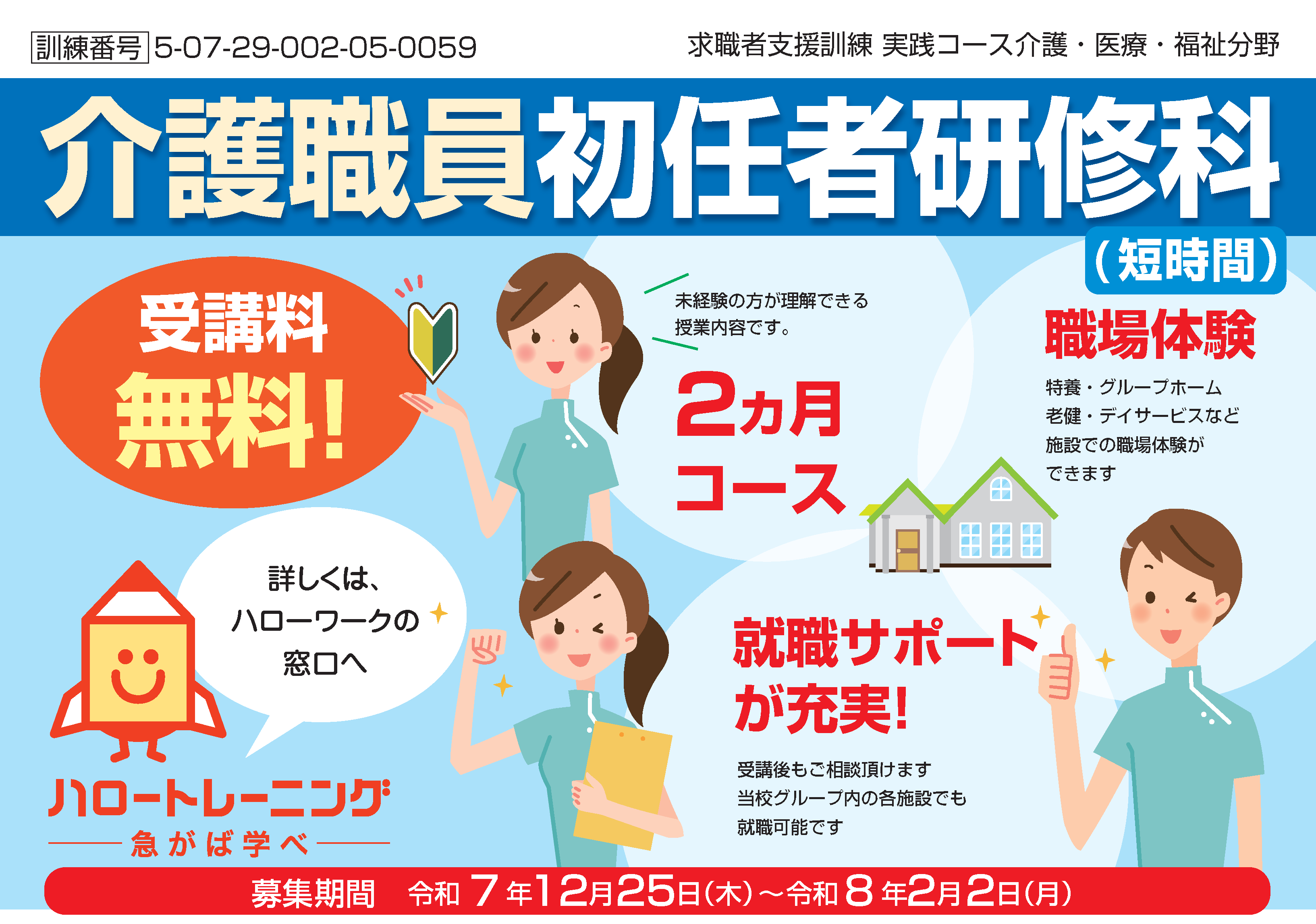 | 受講料 | 無料 ただし、教材費(5,500円)及び職場体験先への交通費2日分は必要です。テキスト代の価格改定等により負担額に変動が生じる場合があります。 |